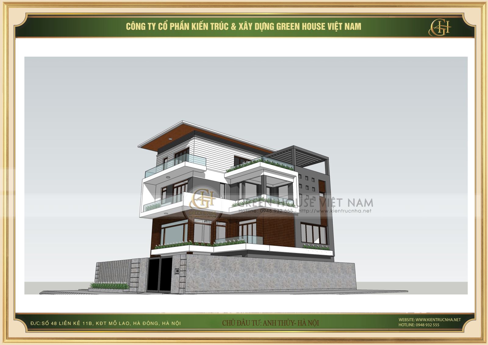 Mẫu thiết kế biệt thự 4 tầng của anh Thủy- Hà Nội được thiết kế theo phong cách kiến trúc hiện đại đang được nhiều gia chủ ưa chuộng hiện nay. Khi nhìn từ xa thì vẻ đẹp của căn nhà phố vô cùng cuốn hút bởi sự kết hợp hài hòa giữa của những khối được thiết kế vô cùng hiện đại. Mẫu thiết kế này mang theo nhiều giá trị của một cấu trúc thiết kế chuẩn mực với nhiều yếu tố tạo hình nghệ thuật. Phủ lên đó là nét đẹp của các nguyên vật liệu trang trí hiện đại với hệ thống cửa sổ, cửa ra vào, lan can ban công được làm bằng hệ thống kính cường lực chắc chắn có độ bền cao kết hợp với khung nhôm tối màu càng làm nổi bật lên vẻ đẹp của lối kiến trúc hiện đại của mẫu thiết kế biệt thự 4 tầng này. Tất cả đều được kiến trúc sư của GreenHouse sắp xếp vô cùng tài tình để tạo ra một nét đẹp mang phong cách hiện đại nhận được nhiều thiện cảm từ chủ đầu tư.