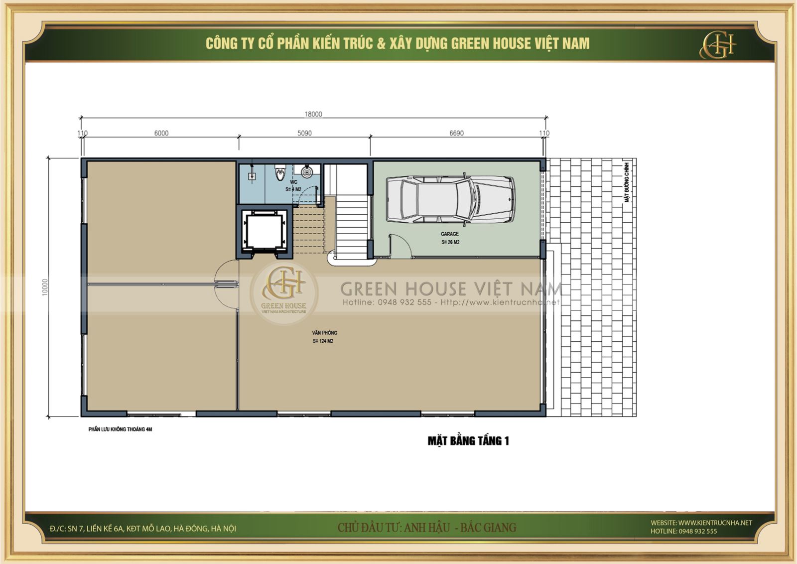 - Mặt bằng tầng 1 : Theo yêu cầu của khách hàng, Green House Việt Nam dành phần lớn diện tích cho khu vực văn phòng và phần còn lại là garage, khu vực vệ sinh