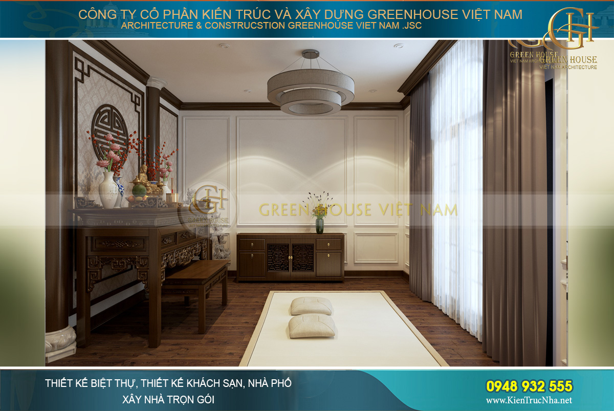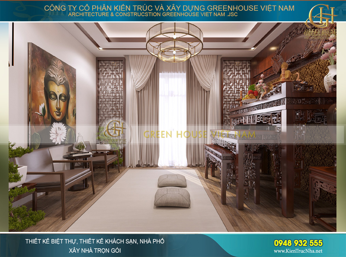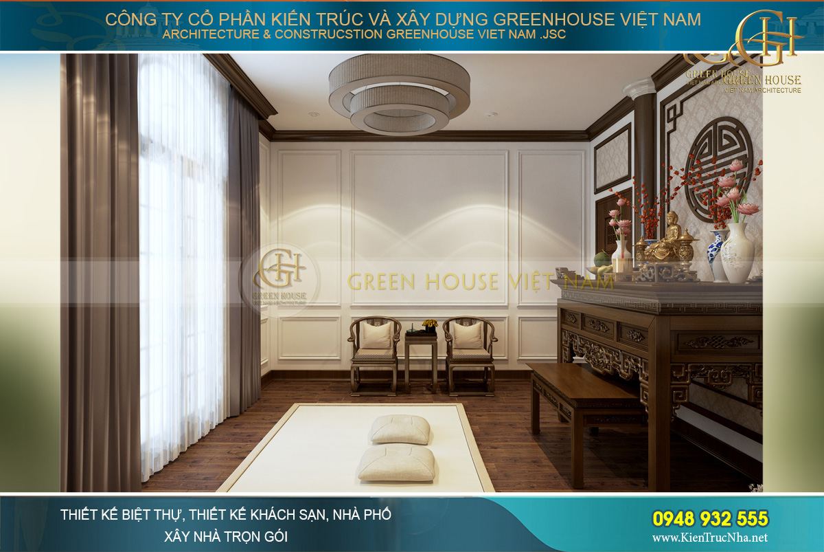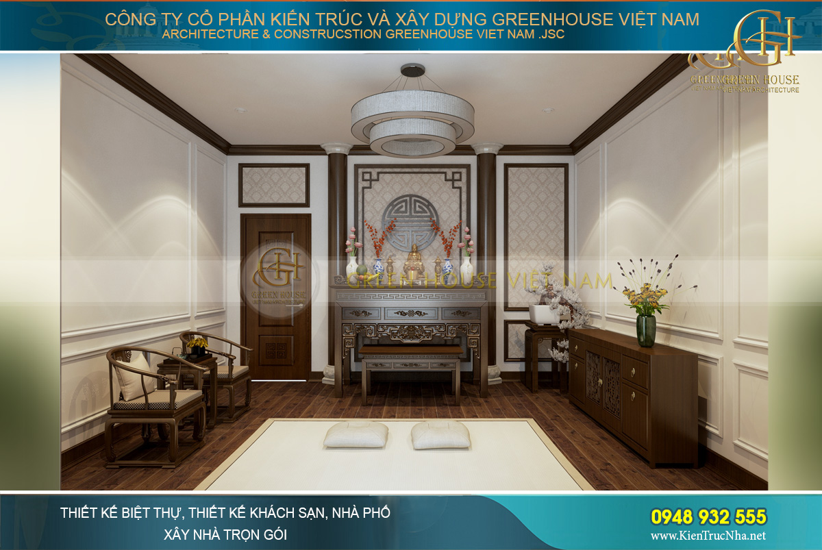 Thiết kế nhà đẹp GreenHouse Việt Nam với những chuyên gia về thiết kế và thi công trọn gói nội thất cao cấp. Ngoài chuyên môn về kỹ thuật, đội ngũ thiết kế còn am hiểu sâu sắc về thiết kế nội thất phòng thờ, nắm rõ những tập quán, phong tục, tín ngưỡng dân gian từng vùng miền. Đồng thời nắm vững những kiến thức về phong thủy chắc chắn sẽ đem đến không gian nội thất phòng thờ ưng ý nhất cho ngôi biệt thự của gia chủ.