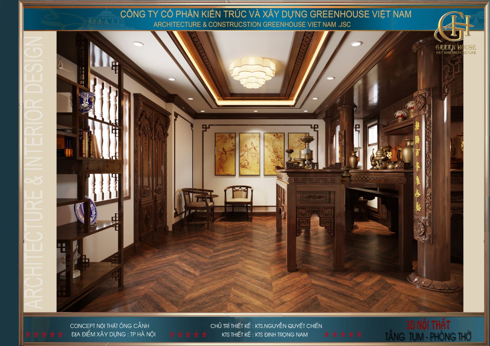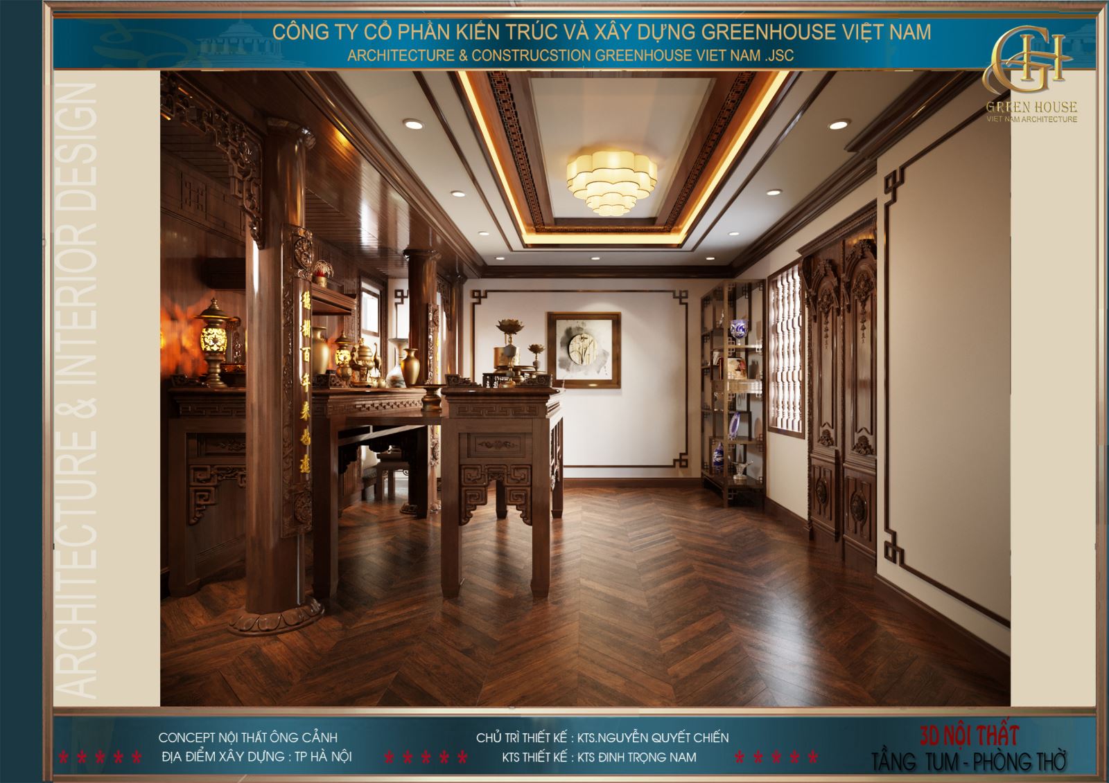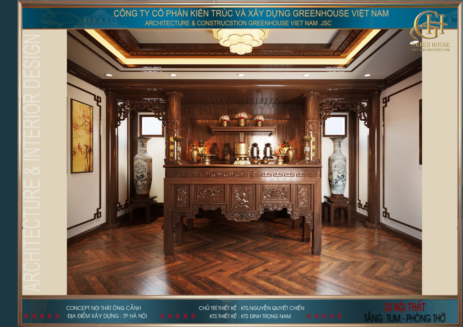 Thiết kế nhà đẹp GreenHouse Việt Nam với những chuyên gia về thiết kế và thi công trọn gói nội thất cao cấp. Ngoài chuyên môn về kỹ thuật, đội ngũ thiết kế còn am hiểu sâu sắc về thiết kế nội thất phòng thờ, nắm rõ những tập quán, phong tục, tín ngưỡng dân gian từng vùng miền. Đồng thời nắm vững những kiến thức về phong thủy chắc chắn sẽ đem đến không gian nội thất phòng thờ ưng ý nhất cho ngôi biệt thự của gia chủ.