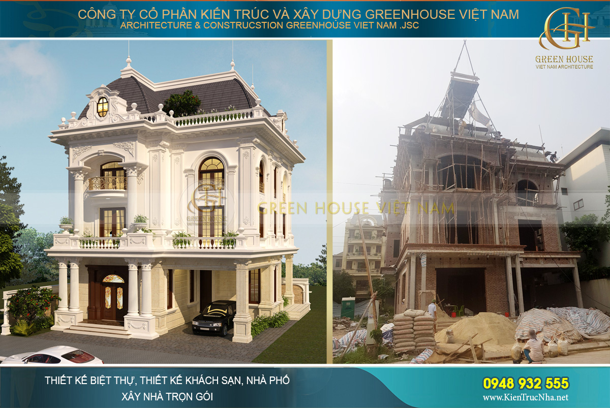 Sau khi ký kết hợp đồng, công ty Greenhouse Việt Nam nhanh chóng bắt tay vào thi công, xây dựng trọn gói biệt thự tân cổ điển 3 tầng cho gia đình anh Dũng. Công trình biệt thự hiện đã sắp hoàn thiện phần thô, 3 tầng lầu và hệ mái mansard bề thế đã bắt đầu thành hình.
